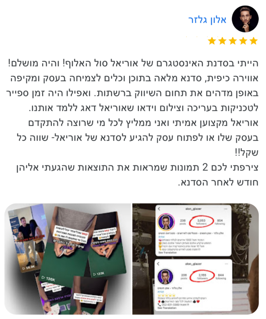 במהלך 8 השנים האחרונות, ליוויתי יותר מ-2,000 בעלי עסקים ויוצרים, והצלחתי להביא תוצאות מוכחות כמו הגדלת עוקבים אורגנית והבאת לידים, בעזרת טכניקות ואסטרטגיות מתקדמות. עם יותר מ-900 סרטונים שעלו לעמוד שלי, הצלחתי לבנות קהילה של 80,000 עוקבים תוך 3 שנים, והפכתי לאוטוריטה בתחומי.