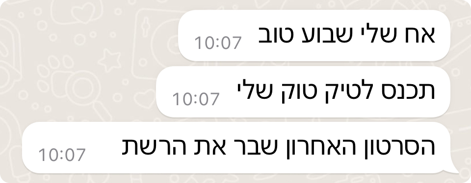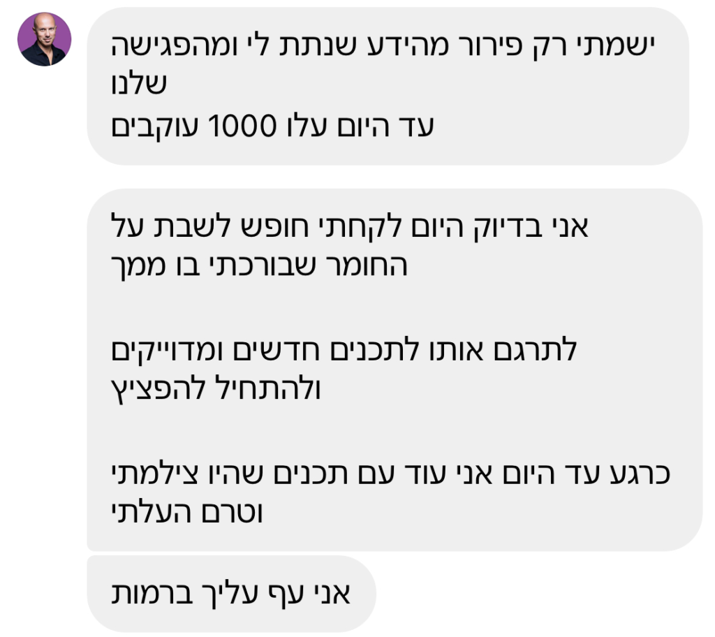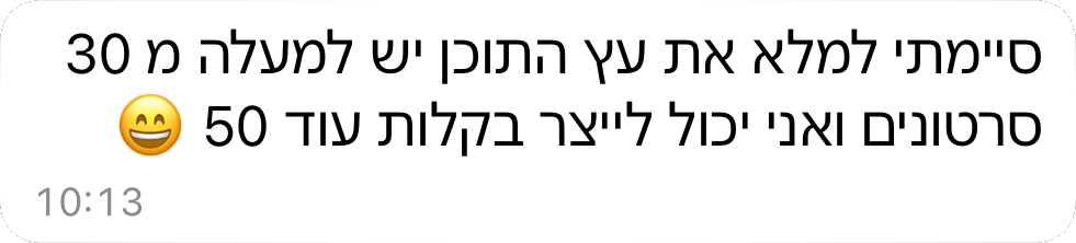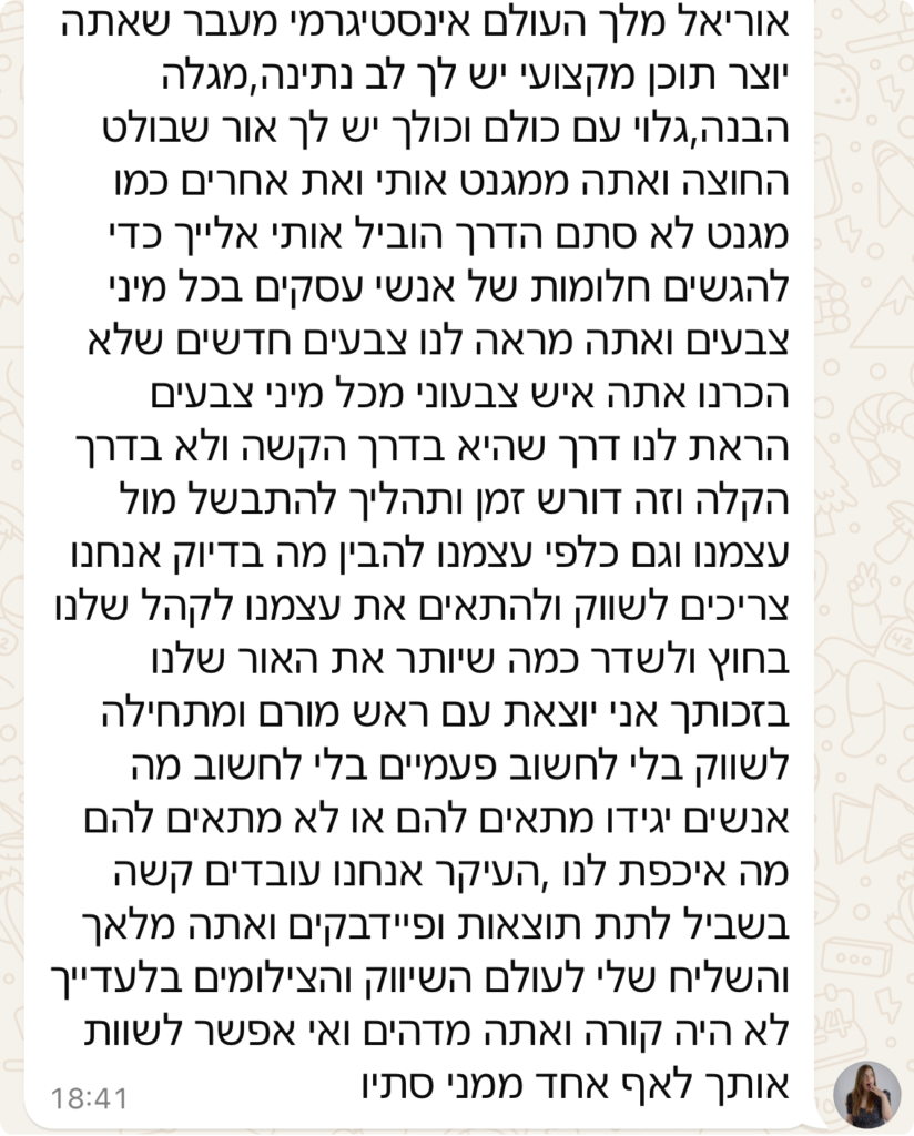 קבוצת ווטסאפ אקסקלוסיבית למשתתפי התהליך בלבד, בה יהיה אפשר לשאול שאלות, להתייעץ, לקבל משוב ולחוות את התהליך יחד. אך אני נותן מענה לשאלות בתוך הקבוצה כך שכולנו נתפתח יחד ונוכל להתקדם בצורה אפקטיבית.