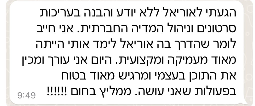 במהלך הקורס נתחיל ליישם את הידע כבר בשיעורים הראשונים, כך שתוכלו לראות שינויים והתפתחויות תוך כדי התהליך. עם זאת, תוצאות משמעותיות מגיעות עם התמדה לאורך זמן. הקורס מתמקד בבניית מותג יציב ולא בתוצאות רגעיות, כמו שניתן לראות אצל תלמידים שהגיעו להישגים מדהימים בזכות ההתמדה ויישום.